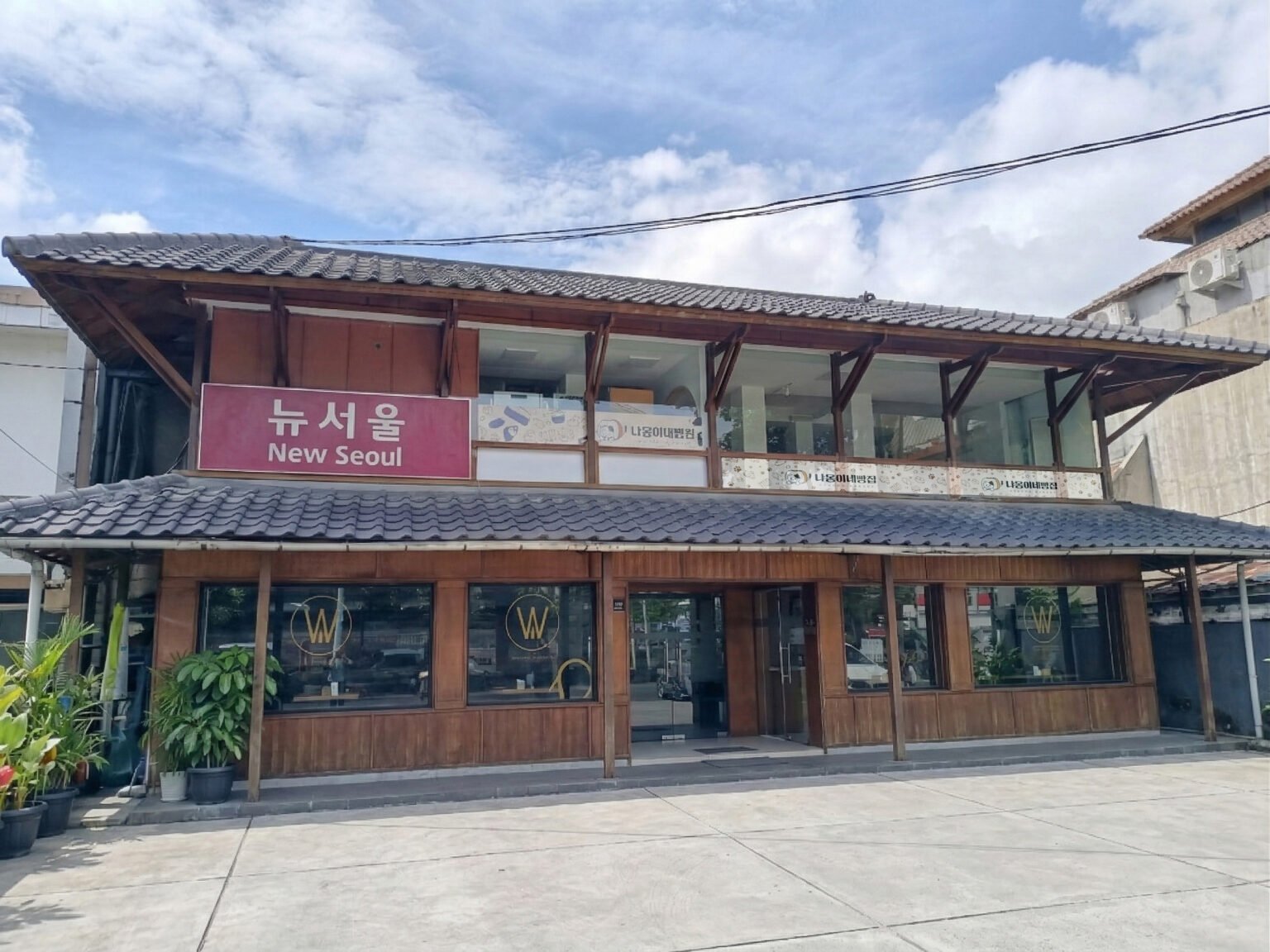 Branding & Signage Integration: The design successfully accommodates different branding styles. The ground floor utilizes minimalist, elegant gold “W” logos directly on the glass, maintaining a sophisticated and uncluttered look. The upper floor provides practical space for more traditional, highly visible rectangular signboards (like the “New Seoul” sign).